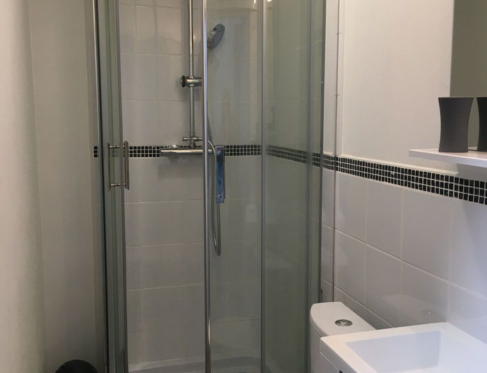 La salle de douche possède une douche en angle de 80 cm avec lavabo et WC (sani-broyeur).